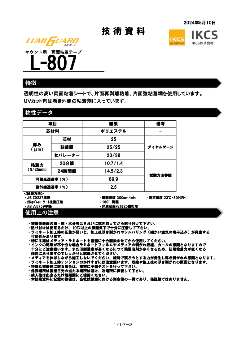 ・万一材料に起因する不具合が生じた場合、材料のみ代替提供致します。出力製品台、施工代等のクレームは負いかねますので事前の確認を十分に行ってください。